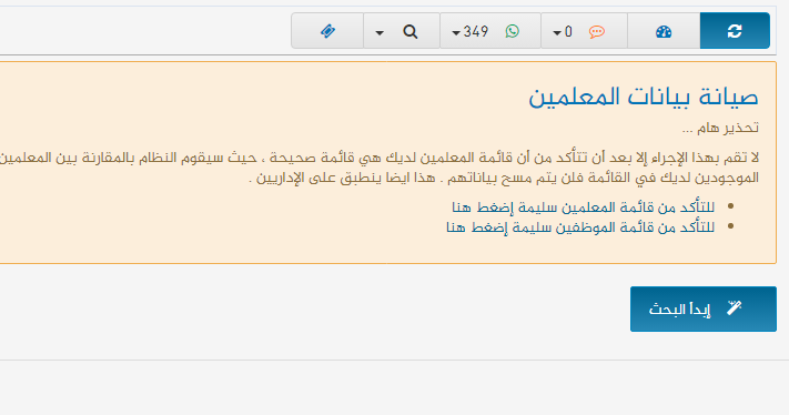أضيفت ميزة صيانة بيانات المعلم من خلال قائمة / صيانة البيانات / صيانة بيانات المعلمين وذلك لإزالة مايتعلق بالمعلمين السابقين المسجلين في مدرستك ولم يعد لهم وجود وظيفي في المدرسة ، بعض الصفحات الأخرى تحتفظ ببيانات المعلمين وحتى بعد استيراد بيانات اخرى ،