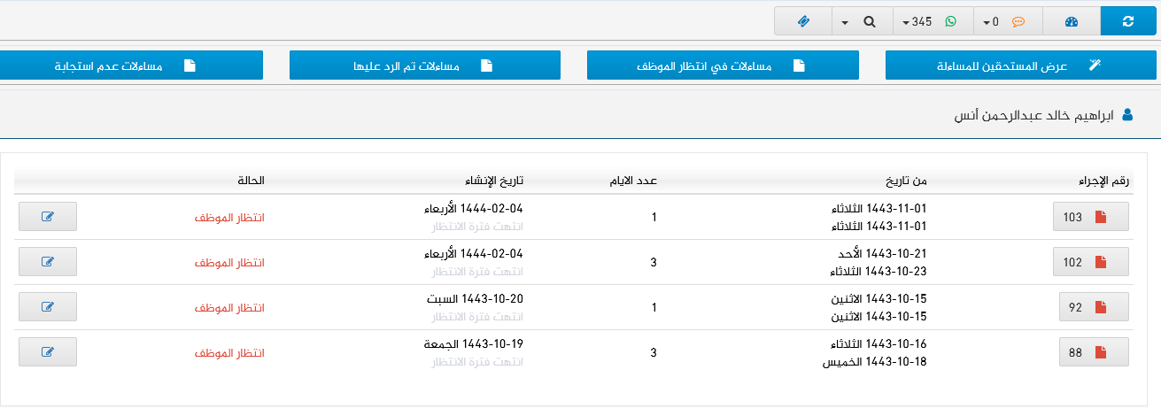 تسهيل الاطلاع على المساءلات التي تمت للموظف من خلال لوحة للمساءلات التي في طور انتظار الموظف أو التي تم الرد عليها .